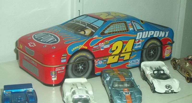 You get a lithographed racecar tin, with a small bag of Jeff Gordon chocolates, which are like little racecars made of chocolate with crisped rice, and wrapped in lithoed foil. More chocolates are available in bulk for refills.