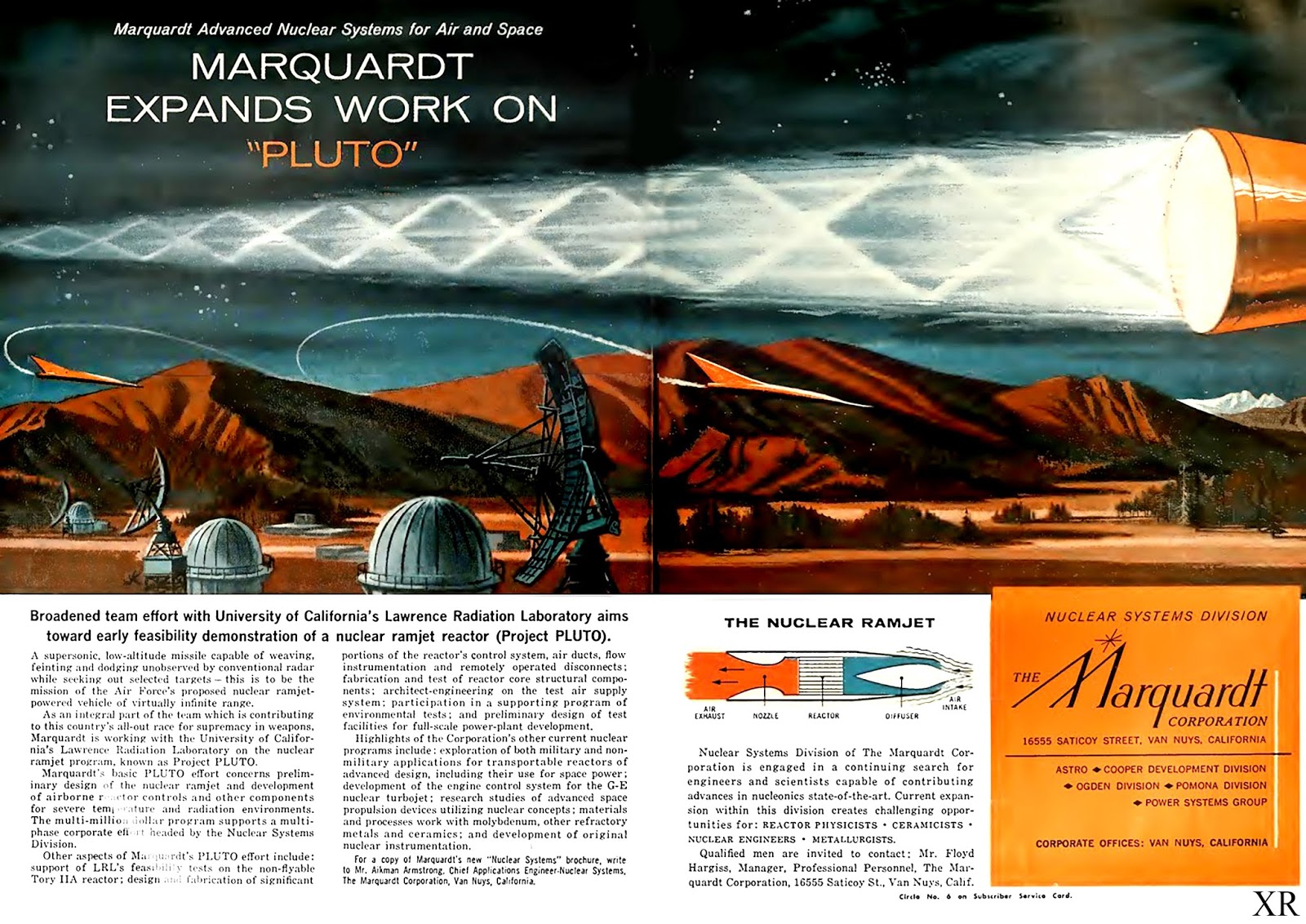 OMG! A full-colour magazine ad for Project Pluto! This is probably one of the most nightmarish devices ever dreamt of. Pluto was going to be a low-altitude hypersonic unmanned cruise missile powered by a nuclear ramjet. The engine design was deliberately dirty. This thing would fly around for hours, with the shockwave destroying everything on the ground as it passed over, and the engine spewing fallout in its wake. Some versions would drop atom bombs as they went. Even by Cold War standards, this was an insane weapon. I'm perversely impressed by the abstract, impersonal viciousness of which my species is capable, and even more that we can do it in such a calm, even playful, way. This isn't something done in the heat of battle - this is something that someone had an idea one day, and everyone else was all, "Whoa! That'll fuck 'em up!" It really is a testimony to our ability to think abstractly that we can consider this in the detail needed to make it work, while simultaneously distancing ourselves from what the actual effect of it is going to be. I wonder how much of that is due to having a bicameral brain?