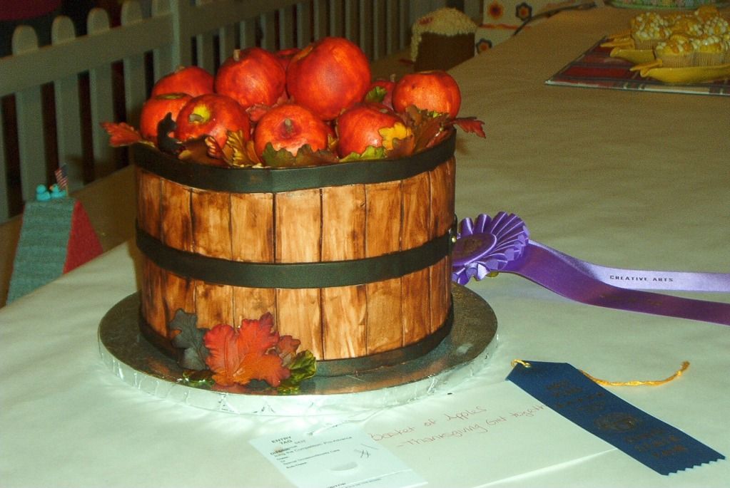 This is an actual cake that someone made and decorated. One hopes it's apple-flavoured, although the sign didn't say. Everyone was dragging their friends 'round to see it. You can see the purple 'Best of Show' rosette that it's won.