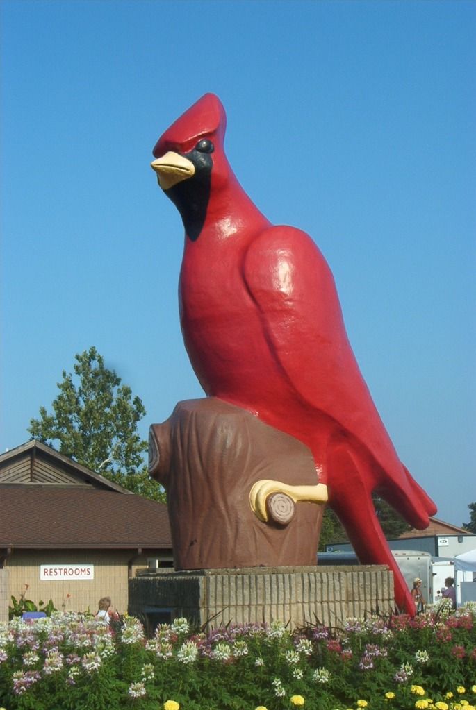 The Giant Cardinal of Ohio, just as you go into the gate. He's been there since 1955. He looks pissed off, and also like he's humping that log. Some have theorized that the bellicose expression is because he's facing toward Michigan, our hereditary enemies to the north. This is his humping log, and no dumb Wolverine is going to come take it away. You can see him just below Gate 1 on the map.