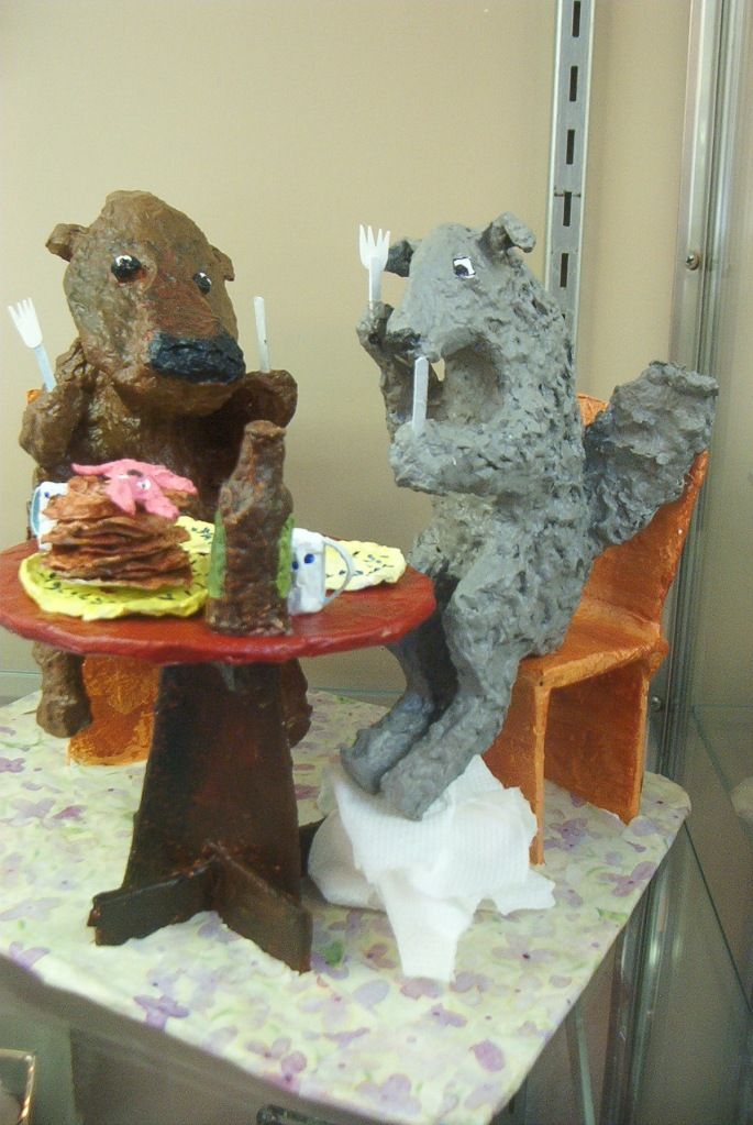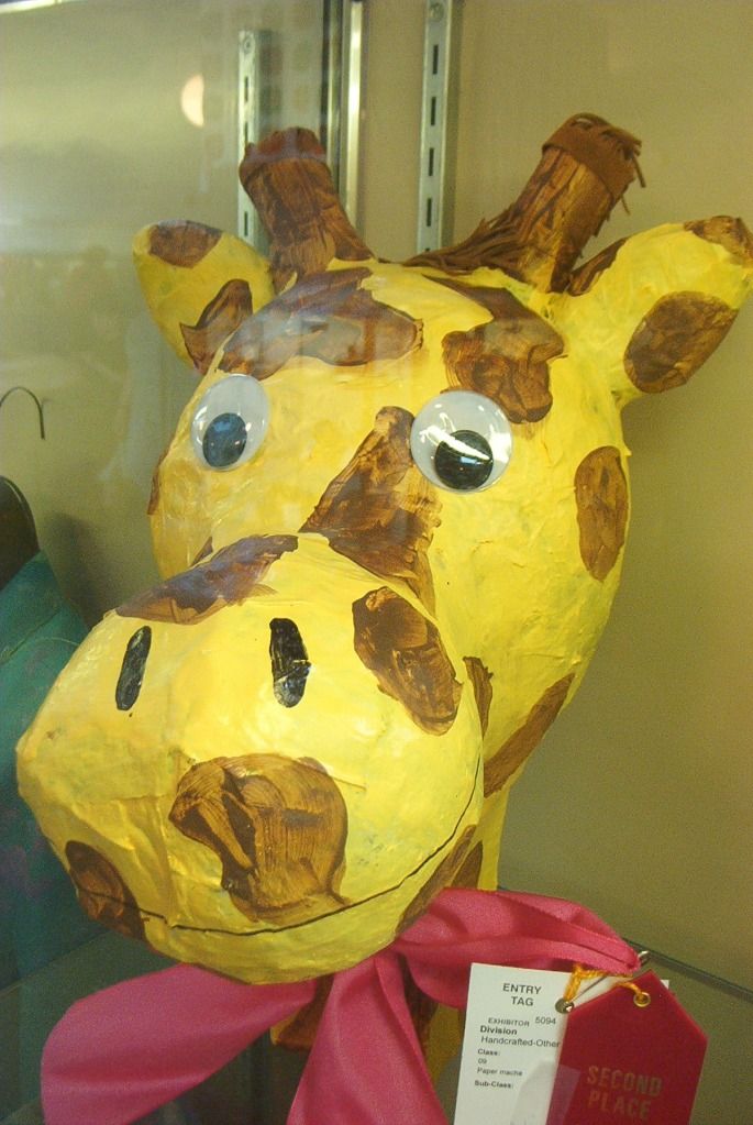 The display halls at the back of the building holds handicrafts, foods, and children's art. Here're a papier-mache Giraffe, and two creatures having dinner. The second scene makes me think of Spindizzy :)