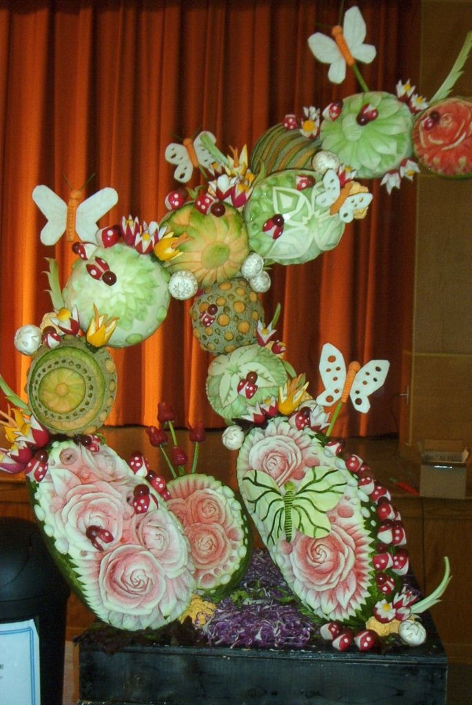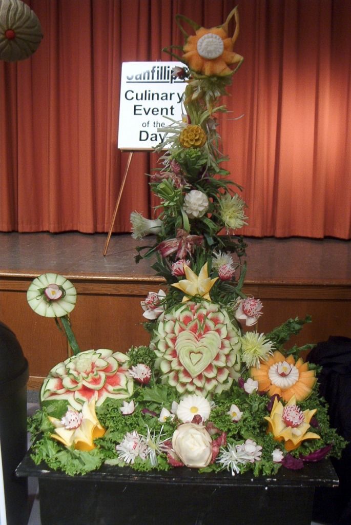 Today the auditorium was filled with chefs from various catering firms carving banquet centrepieces from melons. Melon carvings are by their nature an impermanent art, so if you stuck around to the end (I didn't) you got to help eat the artwork.