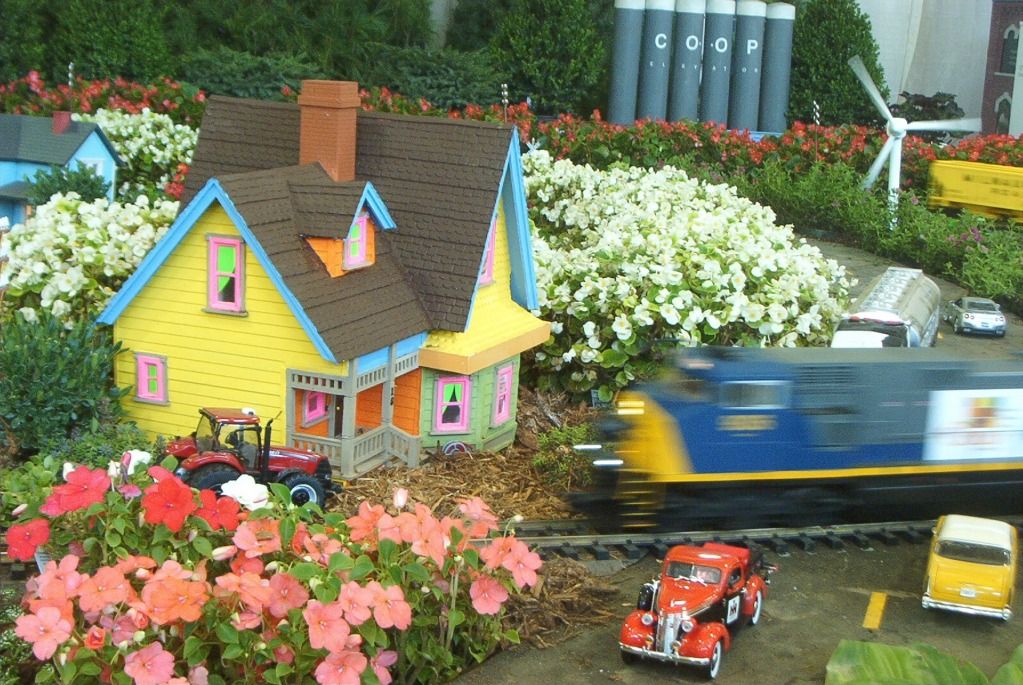 Another of the train layouts. This one is agriculture-themed, and uses really big trains, the sort normally seen in a backyard layout. The positively glowing house, along with the giant flowers, make me think there's been some sort of science fictional mishap.