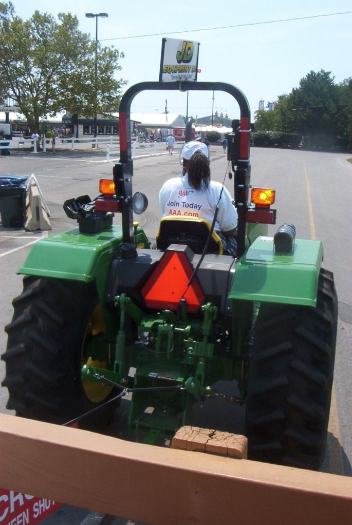 We rode into the Fair on wagons pulled by tractors. These are free, and keep circulating through the parking areas all day long. Once you're inside, there's a different set of wagons that will move you around the fair, again for free. To the left up ahead, you can see the unloading area (the fences) and the main gate.